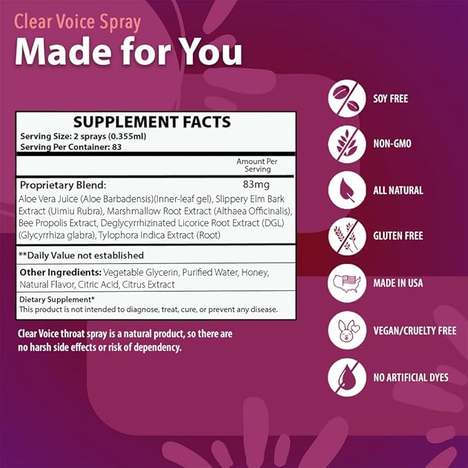 - What is Clear Voice? Many singers have wanted to learn how to sing better. Have you ever tried to sing at band practice without a voice or vocal spray, or in the studio and your voice was not sounding quite right? Then it’s time for a natural throat spray. There is no need to panic because of a pitchy, hoarse, or cracking voice. Now you can learn how to sing better with a simple singing spray. Clear Voice is the best singing spray vocal remedy to amplify and perfect your vocal performance.