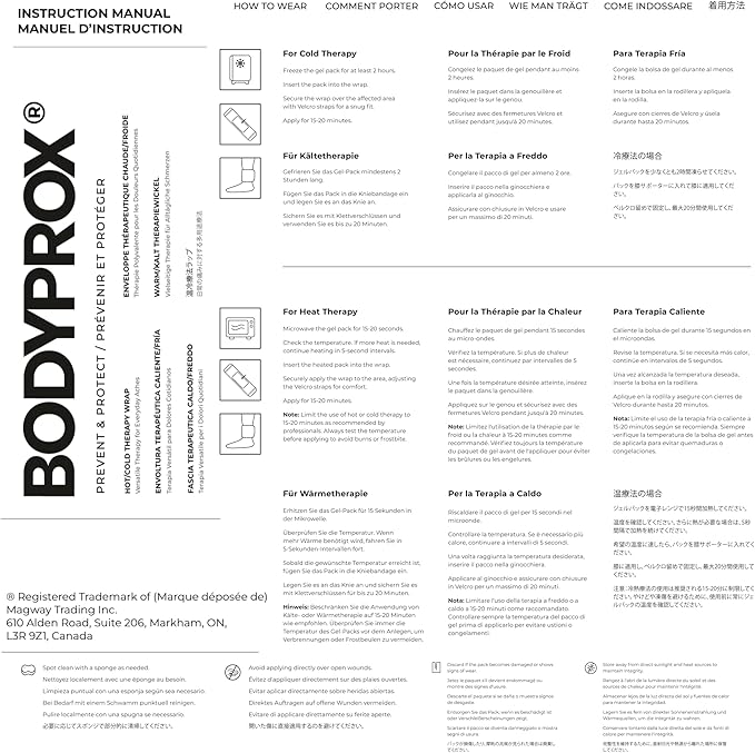 - The BODYPROX Hot & Cold Therapy Wrap features a soft, reusable gel pack that maintains its temperature for about 20–25 minutes. Adjustable hook-and-loop straps make it easy to secure in place for hands-free relief—tighten the wrap to add soothing compression where you need it most.