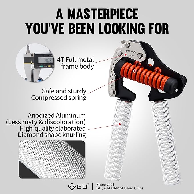 - [Incredible build quality] Made with aluminum handles, strong compressing springs, and 4T iron; GD Iron grip is sturdy as a tank. GD aims for high quality and perfect craftsmanship. This durable and safe hand strengthener is the only grip strength trainer you will ever need.