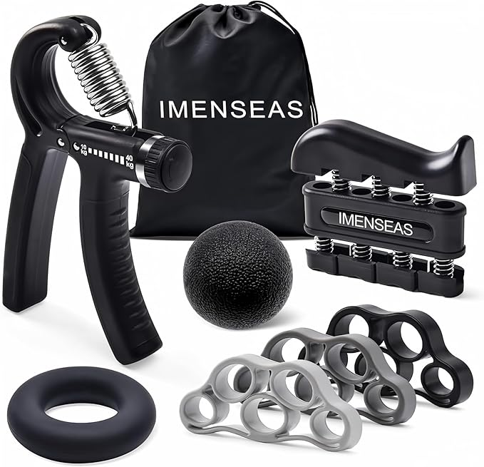 - 【Grip Strengthener Trainer Kit-7 Pack】: The Grip Strengthener Trainer included adjustable hand gripper (22-88Lbs), 3 finger stretchers (6.6Lbs, 8.8Lbs, 11Lbs on each finger),finger exerciser (4Lbs on each finger), hand strengthener grip ring (50Lbs), stress relief grip ball.