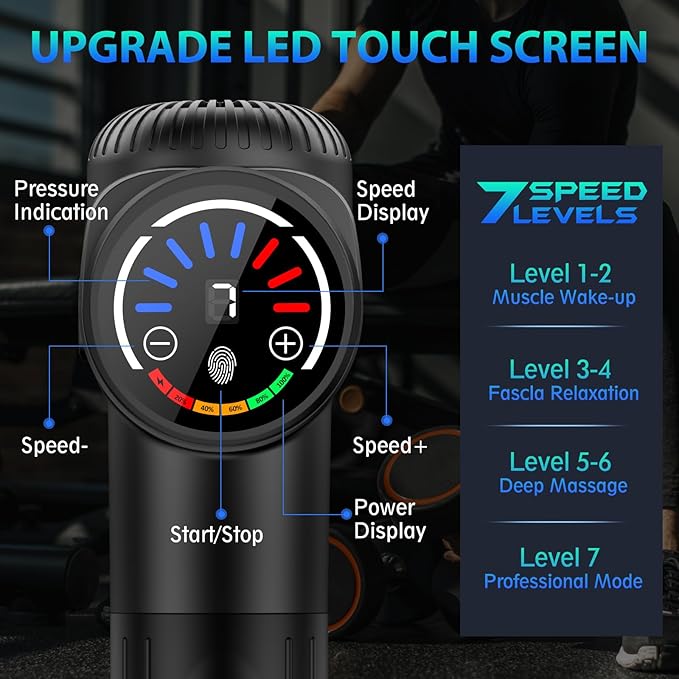 - Smart LED Touch Screen: The massager gun is equipped with an intelligent LED touch screen design and battery display design, allowing you to easily adjust the speed level and view the remaining battery. TOLOCO unique flowing light design also makes the operation more technological