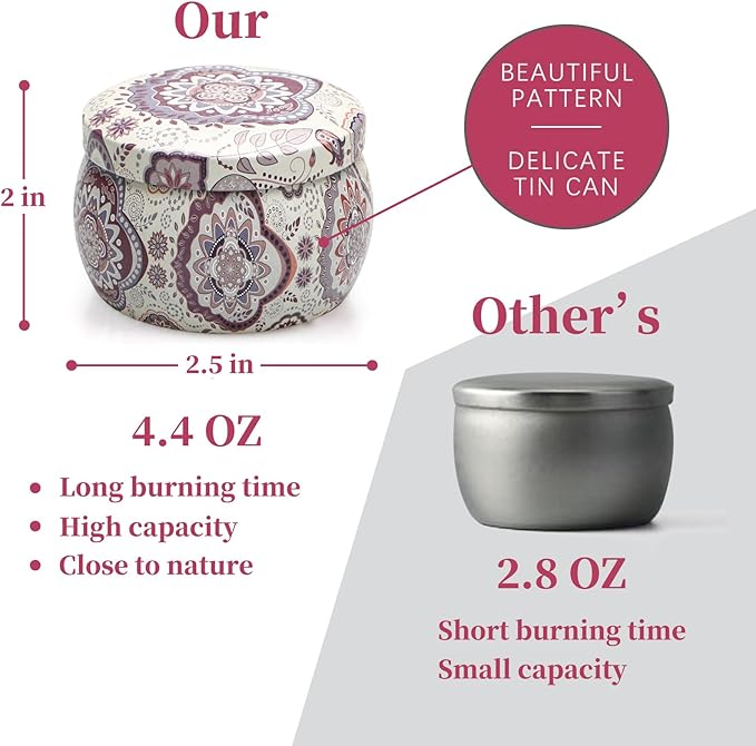 - 120 H Long Lasting Fragrance - 160 grams 4.4 oz per candle, can provide 25-30 hours continuously burning. 4 Pack working time is 100-120 hours. It's portable design make it suitable for both at home or in travel