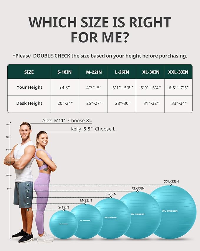 - [Easy Inflation and Perfect Packaging] -Trideer exercise ball comes with a quick inflation pump (45/55/65cm equipped with a hand pump; 75/85cm equipped with a foot pump), 2 air stoppers, and detailed instructions. Available in 5 sizes—45cm, 55cm, 65cm, 75cm, 85cm—to meet all your needs.