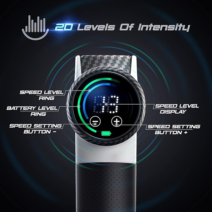 - Pro Results With 6 Swappable Heads And 20 Intensity Levels: As you check out the pictures, notice the 20-speed levels and 6 unique attachments to quickly massage away pain and stiffness; From deep-tissue massage on your back, legs, and arms, to softer options for more delicate tissue in the neck and head - find just the right combination to enjoy refreshed and restored muscles (without costly massage therapy sessions)