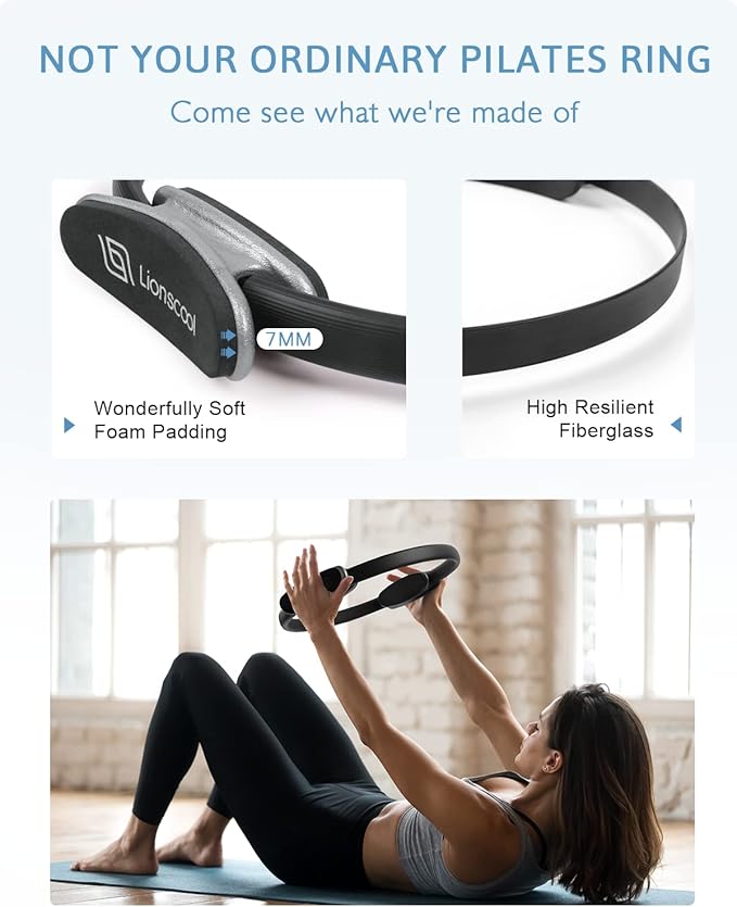 - Built to last: You don’t need all of that bulky equipment to get started if you are new to Pilates. This 14-inch LIONSCOOL Pilates Ring is where the magic happens. It boasts high grade, resilient fiberglass encased in a thick rubber shell, which gives the ring a superior resistance and durability. It also features an unrivalled comfortableness thanks to the wonderfully soft, 7mm thickness foam padding on both inner and outer handles. Take your Pilates anywhere, anytime with this Magic Circle.