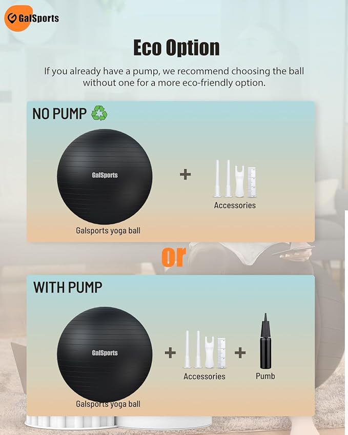 - 【Less Carbon Footprint, Greater Value】 We offer two options: the exercise ball with a pump and without a pump. Please kindly choose the ball without a pump if you’ve had one to join us on a mission to reduce our carbon footprint and protect our environment.