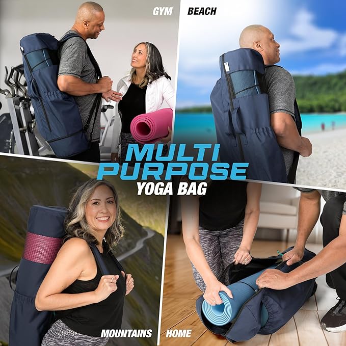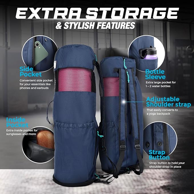 - MULTI-FUNCTIONAL POCKETS: This gym bag yoga mat holder has several large and small pockets to securely place your yoga gear and accessories. This yoga bag for women and men can fit 2 yoga blocks, a water bottle, a towel, straps and more (based on size of items).
