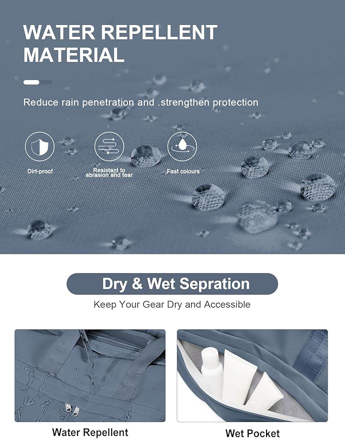 - 【Waterproof & Dry Wet Pocket】The bag is made from high-density waterproof material to repel water and keep the contents inside dry. The bag has a compartment designed specifically for separating dry items from wet ones like wet clothes or towels