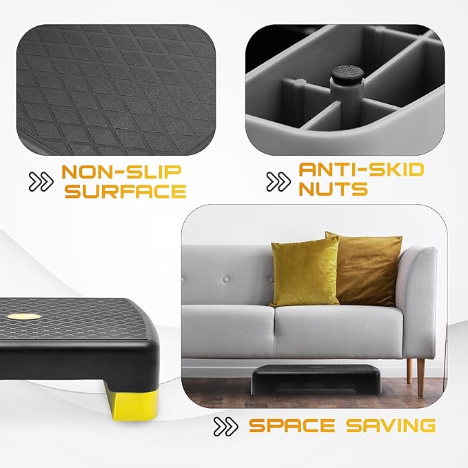 - NON SKIP & ANTI SKID: Mini stepper comes with diamond knurled surface platform & thickened rubbers on each risers providing grip & traction for high intensity workout, squats, pushups & protect your floor from scratching during use