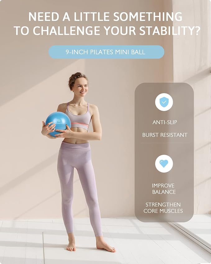 - Pilates Mini Ball & Resistance Bands: The Mini ball is used more often in Pilates classes worldwide. Made from anti-slip, burst resistant PVC materials, the soft and squishy 9-inch exercise ball will challenge your stability and improve your balance. Crafted from high-quality fabric, the fabric resistance bands with three resistance levels offer maximum durability and comfort. You can tailor your workout intensity to your fitness level and goals.