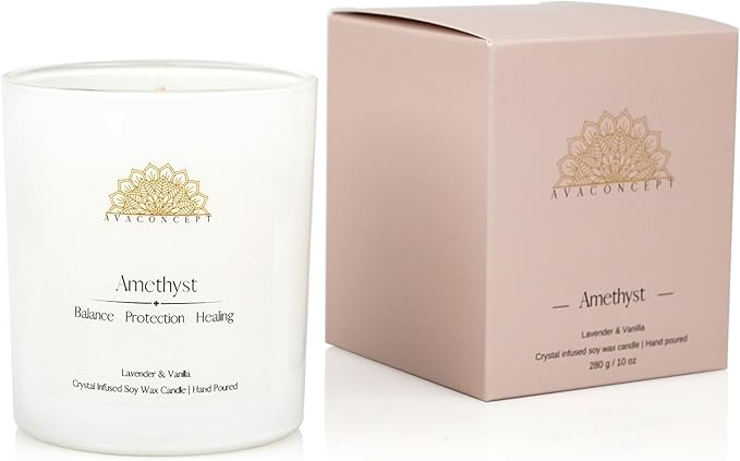 Healing Crystal Candle, Scented Candle Infused Amethyst and Clear Quartz Crystals, Lavender & Vanilla Scented,Positivity Energy Wellness, Gift for Women Aromatherapy Clean Vegan 10Oz Jar