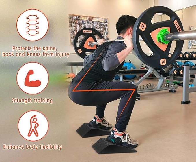 - [BENEFITS]: Training with a oversized squat wedge block can help non professional athletes perform high load workouts without undue stresson the lower back,improve ankle and hip flexibility,optimize knee stability and prevent injury.the squat wedge for heel elevated squat prevents falls.