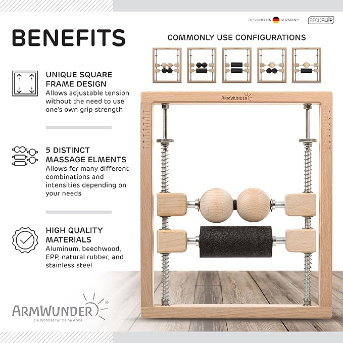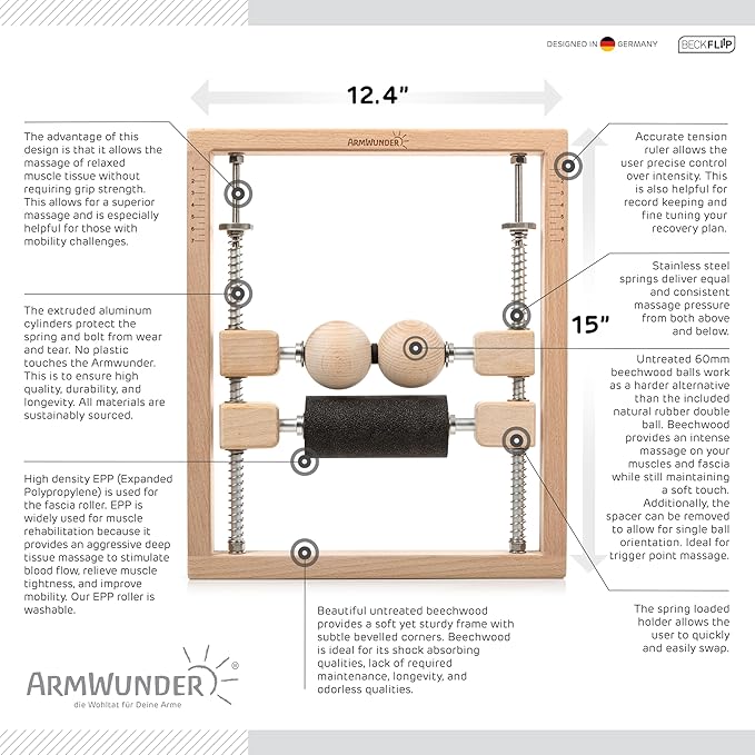 - HIGH QUALITY CONSTRUCTION - We have spent many years designing this device in Germany to include the highest quality components. You will not find any plastic anywhere on the ArmWunder - this is because we wanted to build a product that will last a lifetime. We use 100% sustainable beechwood, high quality aluminum, stainless steel, EPP high density foam, and soft rubber. All nuts, washers, knobs, and springs are machined to the highest quality.