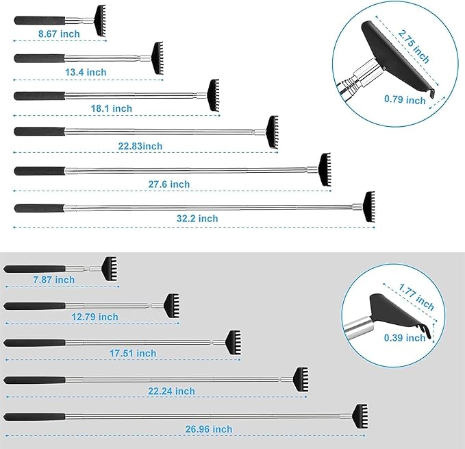 - ۞ PORTABLE AND LIGHTWEIGHT - The small size of these telescoping back scratchers means you can take them with you anywhere. Perfect for storage or travel.