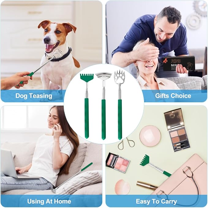 3 Pack Different Back Scratcher Metal Portable Telescoping Back scratchers with Rubber Handles, Extendable Back Massager Tool with Beautiful Box Great Stocking Stuffers(Green)
