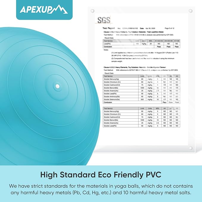 • [SAFE & ANTI BURST] APEXUP Exercise ball is made of high-quality, eco-friendly PVC material, which meets stringent safety standards. It's non-toxic, odorless, and free from harmful heavy metals. With an anti-burst honeycomb structure, it ensures durability and safety during your workouts.
