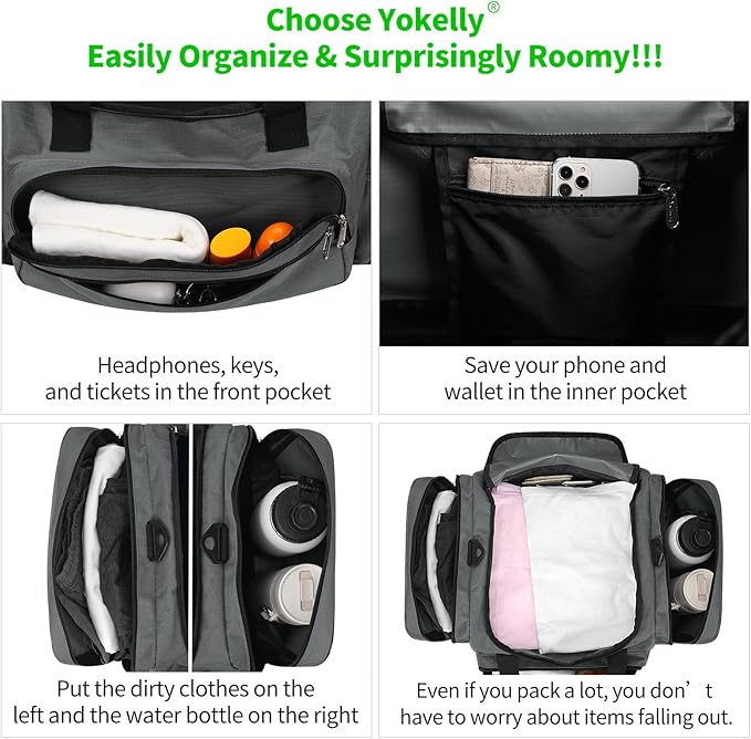 - MULTI POCKETS: Travel duffel bag have up to 6 compartments, 1 main compartment, 2 full size side pockets and 2 extra large front pocket, 1 inner pocket for personal belongings.
