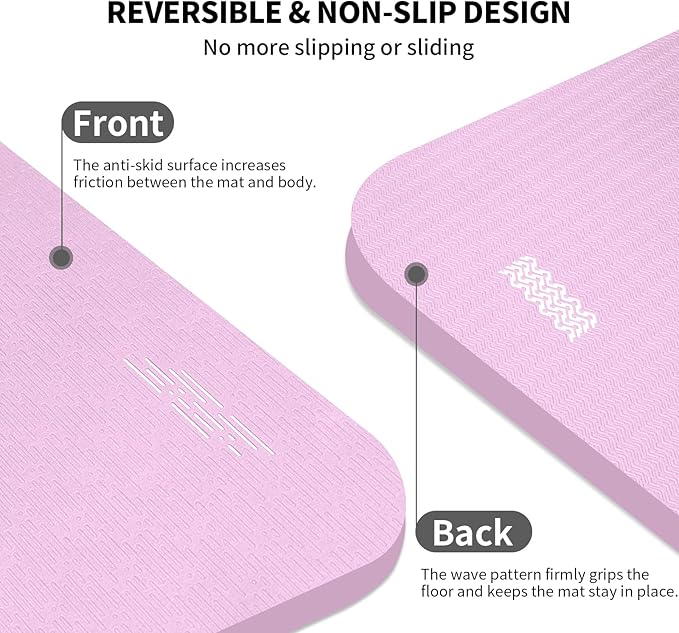 - Non-slip & Reversible Design: The anti-skid surface increases the friction between the mat and body which can prevent your hands, knees and feet from slipping during practice. The wave patterns on back firmly grip the floor ensure the mat stay in place.