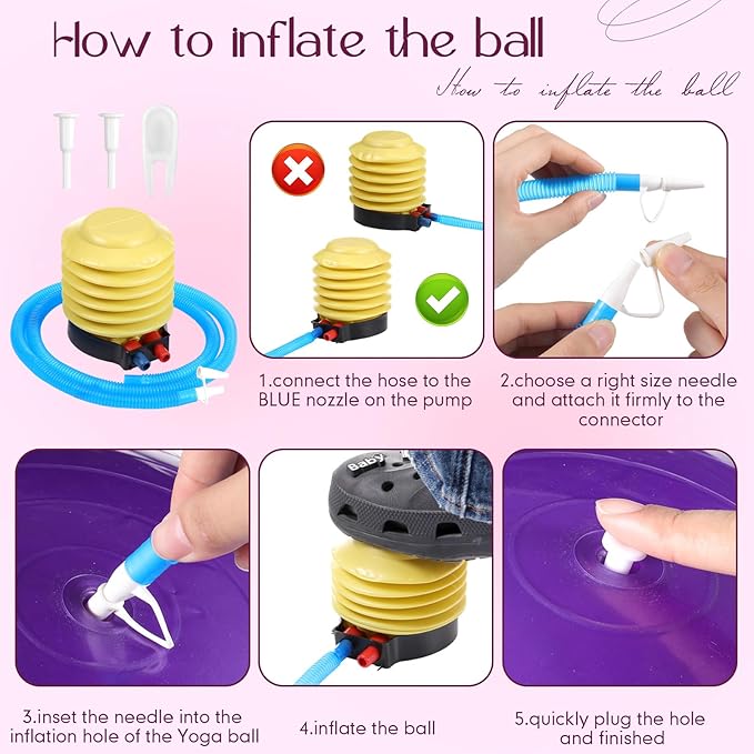- Various Colors: you will receive 4 pieces of exercise balls for working out in different colors, coming in pink, rose, purple and deep purple, 1 piece of each color, equipped with 1 piece of foot pump, 1 piece of air pull, and 2 pieces of air plugs; The complete set can meet your exercise needs
