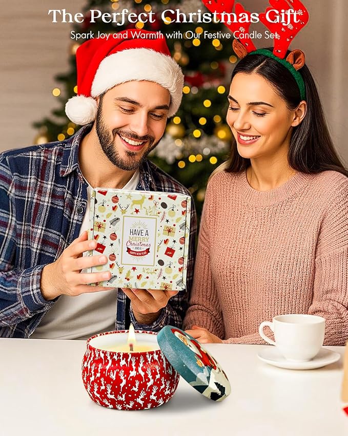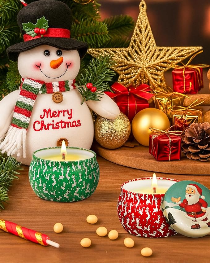 - 【Beautifully Designed Holiday Gift Box】- Each tin features festive artwork — snowmen, reindeer, Christmas trees, and Santa — making it a joyful decoration as well as a thoughtful gift. Packaged in a charming holiday gift box, this candle set is perfect for Christmas, birthdays, or housewarming presents.