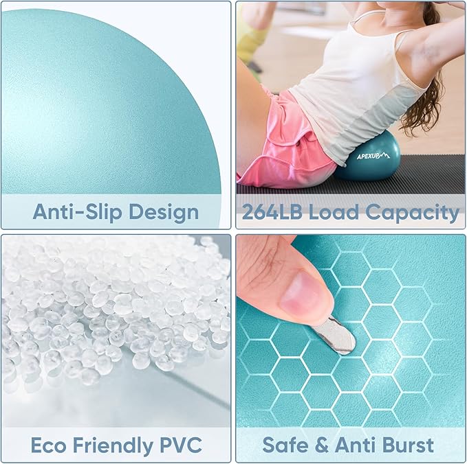 - [ANTI-BURST & ANTI-SLIP] Reinforced with a honeycomb structure for anti-burst protection, this small pilates ball can support up to 550 lbs of weight and will not suddenly burst even when pierced by sharp objects. The fine texture provides non-slip properties, ensuring a safe exercise experience.