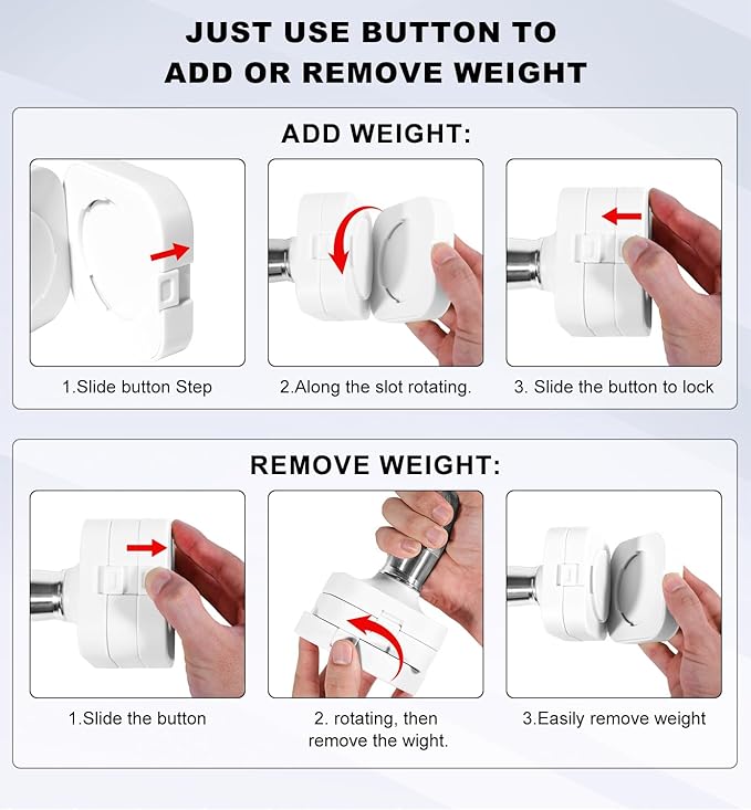 - The mechanism to connect and disconnect the additional weighted pieces are simple to use and twist into place, can be quickly to adjust for more or less weight.