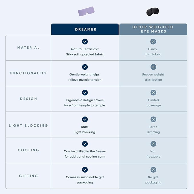 - RELAXING WEIGHT: Meet the Dreamer! This gently weighted sleep mask is designed to cradle your eyes and block out light to help you drift off into dreamland. Made of natural Terraclay encased in silky soft, GRS-certified upcycled fabric, the Dreamer’s soothing weight relaxes your pressure points to relieve tension from your eyes, forehead, temples, and jaw.