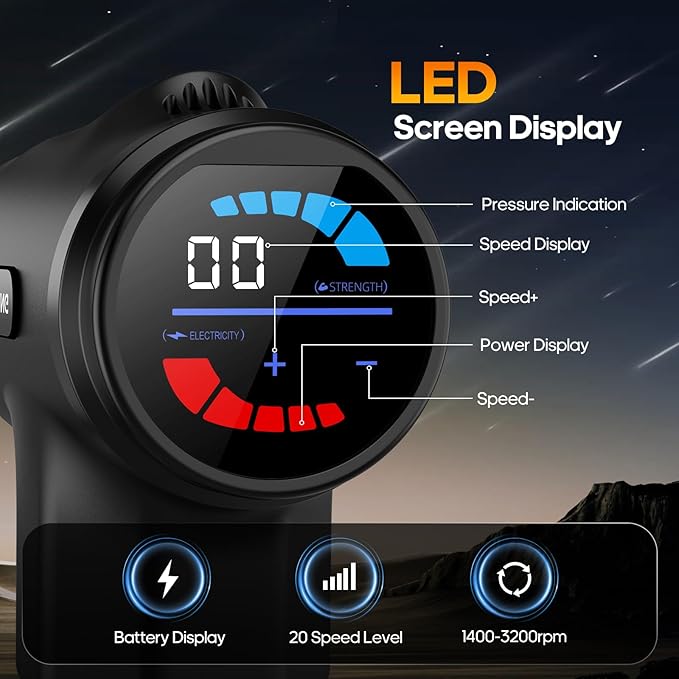 - New Generation LCD Display: AERLANG handheld massage gun uses the new generation LCD technology, which allows easy control and real-time display of the pressure you are currently applying. And it will automatically adjust the pressure you need to provide customized, deep muscle percussion massage