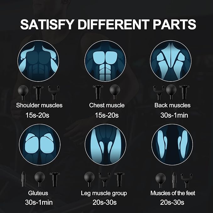 - 【Multiple Strength Options】The massage gun provides 6 different speeds and 4 different attachments. You can press the power button and freely choose any speed and attachment according to the degree of muscle pain and body part to achieve better pain relief, which is very suitable for athletes