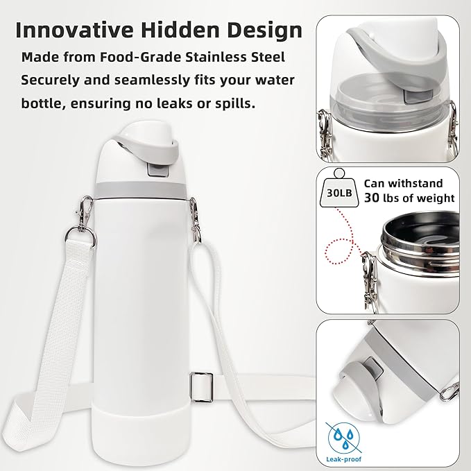 - Hidden Design: The connector is discreetly hidden between the lid and the bottle body, with a stainless steel material that securely fastens the shoulder strap to the water bottle. Whether you're running or walking, you won't have to worry about the bottle coming loose