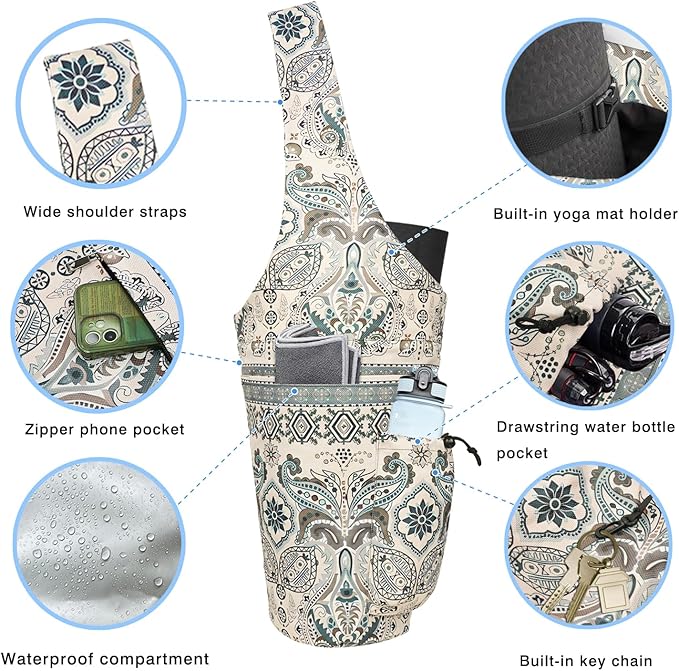 - A all-match yoga bag: Yoga bag for mat is made of high quality materials, no fasteners, no buckles and a comfortable shoulder strap. Combined with fine hand stitching, the Yoga bags printed designs add more color and value to this yoga mat bags, vibrant and eye-catching. The yoga tote bag fits thicker and wider yoga mat easily. With yogis’ genuine needs in mind, this yoga bag brings much convenience into daily organization and storage of the yoga accessories, multi-functional and practical.