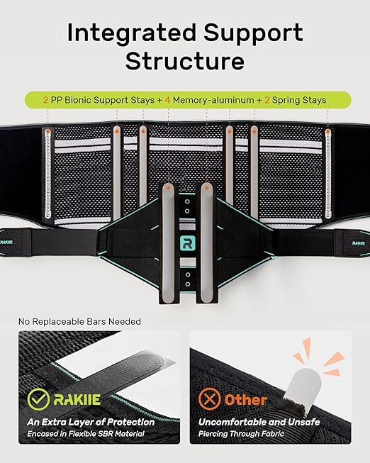 - Immediate Relief for Back Pain with Deep Support: Rakiie back support belt for women offers 8-point back support with 4 memory aluminum alloy bars, providing 4x the strength of traditional braces. Combined with 2 elastic springs and 2 PP bars, the lower back brace for men improves spinal alignment, reduces pressure, and relieves discomfort from sitting, standing, or conditions like sciatica. All-day comfort and lower back pain relief, keeping your torso in a safe supportive posture.