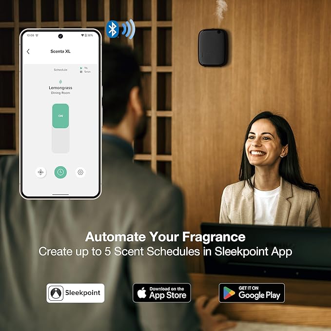 • Flexible Settings Enabled by Sleekpoint App: Download the Sleekpoint app from the Apple App Store (iOS) or Google Play Store (Android OS) and enjoy full controls over Scent XL via Bluetooth: [Power ON/OFF] Easily turn the device or booster fan on/off. [Scheduling] Set up to 5 schedules/diffusing scenes for different times and days to meet your needs for various occasions. [Diffusing Time] 3 sec - 5 min [Pause Time] 5 sec - 19 min. Please stay within 20 feet of the device to connect