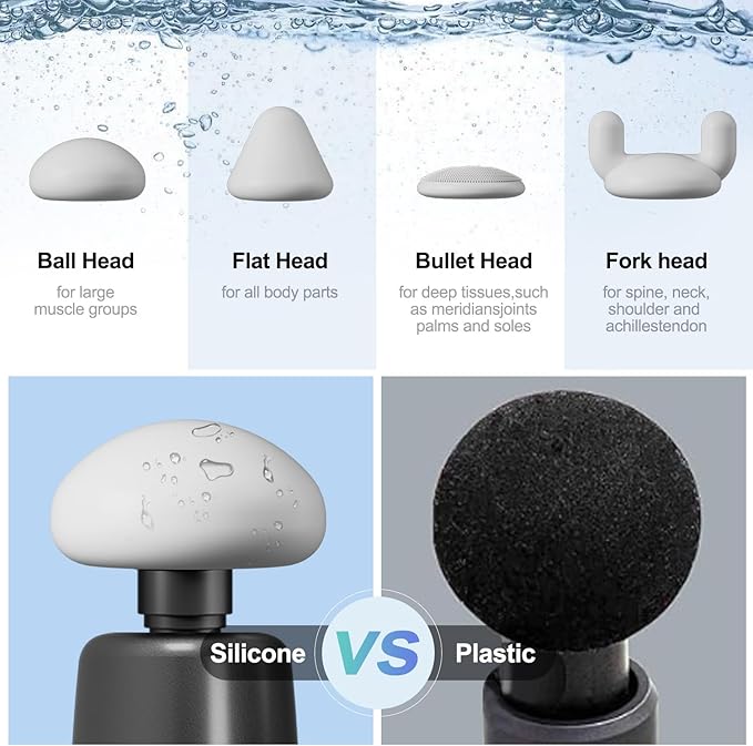 - 4 SILICONE HEADS & 4 POWERFUL HEADS: 4 types of silicone skin-friendly massage heads can target specific muscle groups for faster recovery. Suitable for people who are not stressed, such as mothers and ladies. 4 powerful massage heads can strike sore muscles at a deeper level, suitable for fitness, athletes, and men. Can be widely used on the shoulders, neck, back, legs, soles of feet and other parts
