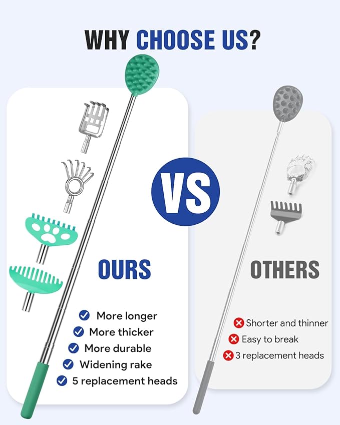 - 5-in-1 Tailored Solutions for Every Itch: Upgrade your comfort with 5 different detachable scratcher heads for scratching, massage, targeted relief, full-coverage comfort, and beard and scalp care. Perfect for back, neck, head, and more, it’s designed to meet all your itch-relief needs. Share with family or switch heads for a personalized experience