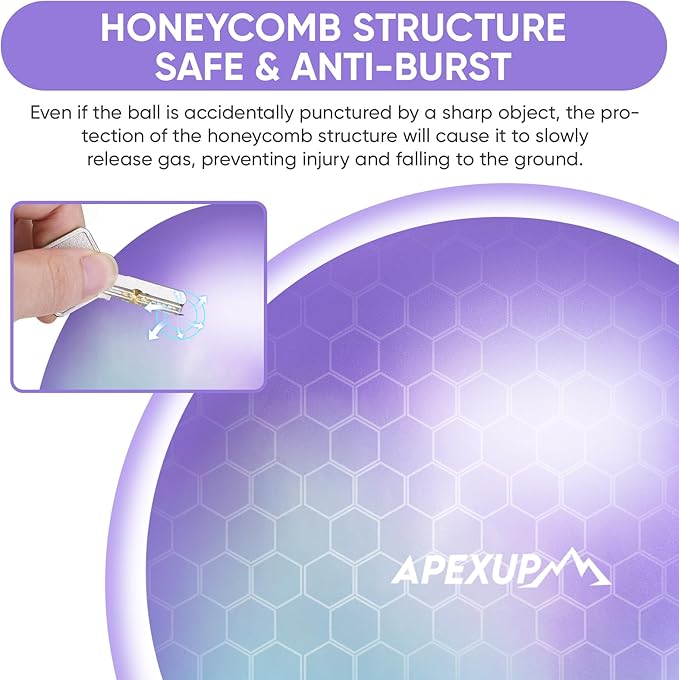 - [SAFE AND ANTI BURST] APEXUP Exercise ball is made of high-quality PVC material, which meets stringent safety standards. It's non-toxic, odorless, and free from harmful heavy metals. With an anti-burst honeycomb structure, it ensures durability and safety during your workouts
