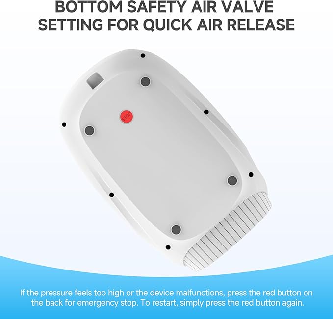 - Soothing Heat & Safety Release Valve: Equipped with 4 precise temperature settings (Off, Low, Medium, High), this hand massager with heat delivers soothing warmth to hands and joints. The therapeutic heat helps relax muscles, improve circulation, and enhance compression massage effectiveness. For added safety, a quick-release valve allows immediate pressure release by pressing the red button on the back, press it again to restart the device.