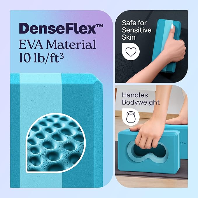 - PREMIUM DENSEFLEX MATERIAL: The yoga bricks 2 pack is made of enhanced-density “foam rubber” EVA that supports your weight while remaining soft to the touch, Each thin yoga block is built to ensure that your props do not compress under the pressure