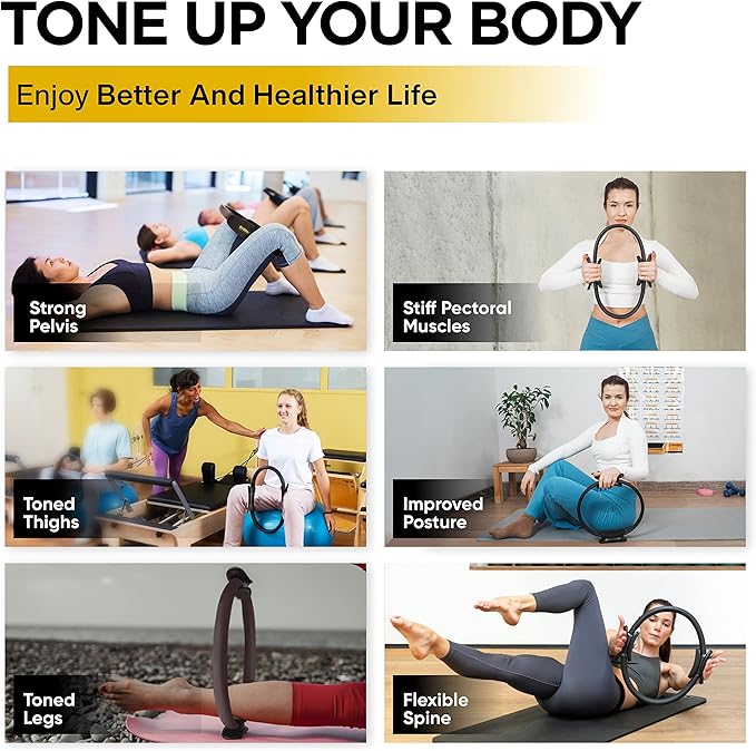 • Strengthening & Toning: With our pilates ring, you can easily target stubborn fat deposits in your thighs, arms, hips & abs. By exercising with our pilates, you'll also improve your wellness by building core, pelvic & spine flexibility.