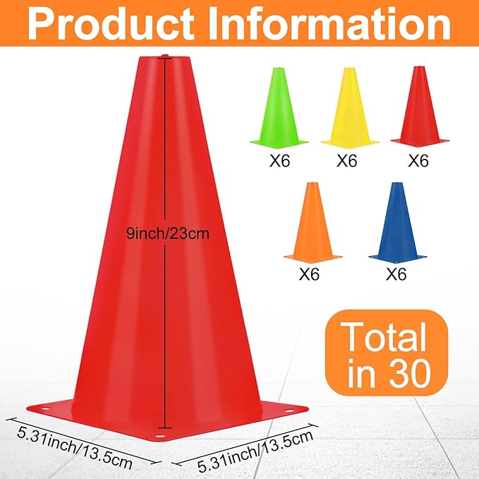 30 Pieces 9 Inch Traffic Cones Plastic Sport Agility Training Safety Cones Soccer Practice Equipment for Basketball Football Drills Exercise, Outdoor Activity and Events