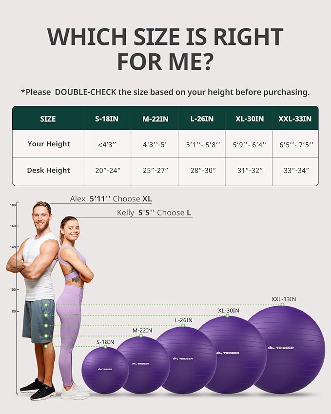 - EASY INFLATION- Trideer exercise ball comes with a quick inflation pump (45/55/65cm equipped with a hand pump; 75/85cm equipped with a foot pump), 2 air stoppers, and detailed instructions; available in 5 sizes to meet all your needs.