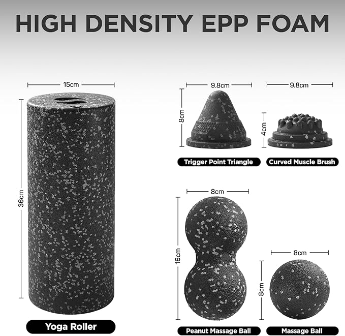 5 in 1 Foam Roller Set with Peanut Massage Ball, Curved Muscle Brush - Yoga Roller, Massage Ball, Trigger Point Triangle for Deep Tissue Relief (Black Gray)