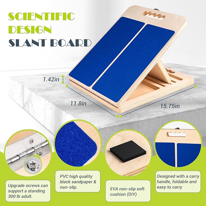 - [Scientific Design Leg Exercisers] Our calf stretcher slant board has a foldable design. A full PVC sandpaper top and a non-slip EVA base provide a better grip to prevent slipping during exercise and use.