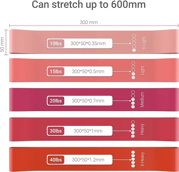 - 5 LEVELS OF RESISTANCE FOR EVERY FITNESS LEVEL: The exercise bands resistance set includes bands ranging from 10 lbs up to 115 lbs when combined, giving you the flexibility to adjust the intensity to your needs. Elastic bands for exercise are perfect for beginners starting their fitness journey as well as experienced athletes who want to progressively increase the challenge.