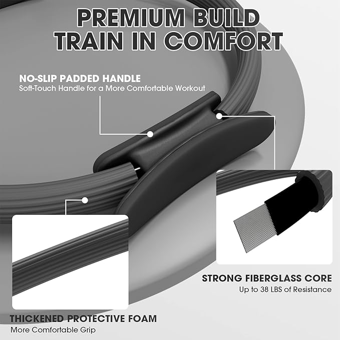 - Enhanced 38lbs Resistance – This Pilates ring features a high-strength fiberglass core for upgraded 38lbs tension, ensuring it won’t bend or warp over time. The dual-padded handles provide a secure, comfortable grip, while the thick foam padding enhances safety and eliminates noise during workouts
