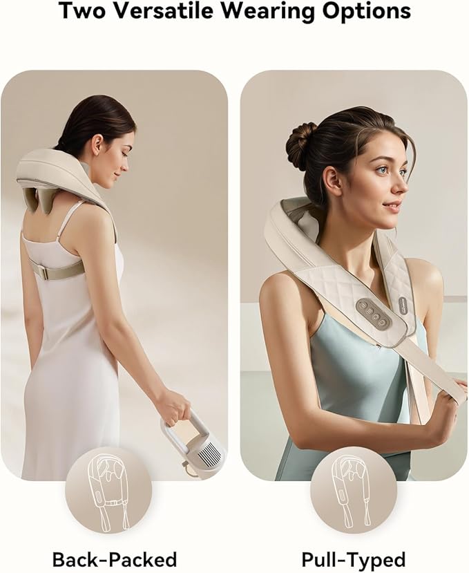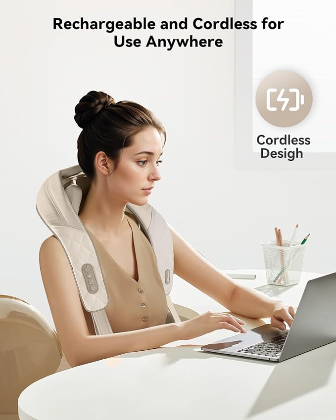 - 【Large Capacity Battery & Portable Durability】With daily use, this cordless neck massager lasts up to a week on a single charge. Featuring USB Type-C charging, it works wirelessly without being tethered to an outlet, letting you enjoy relaxing massages anytime, anywhere. Neck massager with heat compact size makes it easily portable, fitting into regular-sized travel bags, gym bags, or carry-ons.