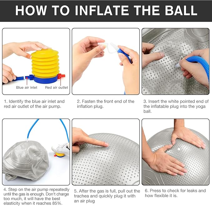 • PACKING LIST AND SERVICES: Gruper exercise ball set, including 1 manual pump, 2 air plugs, 1 gadget and workout guide, you can easily inflate the yoga ball to the hardness you like. We provide 100% satisfactory after-sales service. If you have any questions, please contact us, we will replace or issue a quick refund for you for free.
