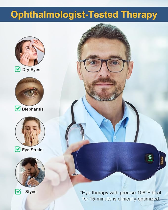- 【Ophthalmologist-Tested Eye Therapy】 BeeVines cordless heated eye mask for dry eyes delivers clinically-optimized therapy with precise 108°F heat for 15-minute sessions - the ideal temperature & duration for effectively unclogging oil glands while relieving dry eyes, blepharitis, eye strain, & styes. Its medical-grade heating system ensures even heat distribution, while the 1500mAh battery provides 13 full sessions per charge (30% longer than standard masks) with automatic shut-off for safety.