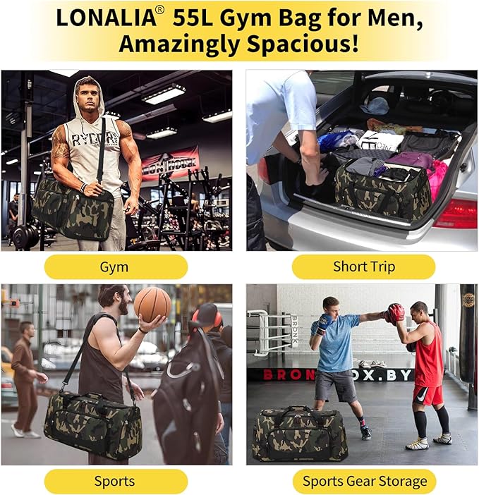 - Versatile Use: This versatile mens duffle bag is perfect for gym-goers, athletes, travelers, and anyone needing a reliable bag for essentials. Ideal for weekender overnight, gym days, or long trips, the 55L sports duffle bag meets all your needs.