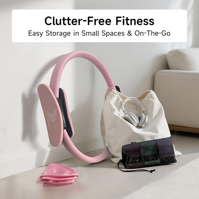 - Effortless Storage for Space: No more cluttered workout areas! The Pilates ring tucks neatly against walls, the mini ball deflates to a compact size, and resistance bands roll up easily—plus a free small storage pouch to keep the bands organized. Perfect for small apartments or travel, this Pilates kit frees up your space while keeping your fitness tools ready whenever you need them.